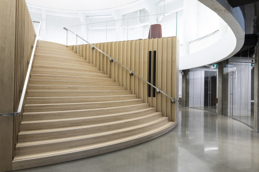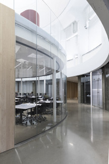Le verre courbé a représenté quelques défis de par sa provenance, importé de la Nouvelle-Zélande, et par sa hauteur de 15 pieds. QMD a de plus construit deux escaliers courbés en bois d’érable afin de créer une mezzanine centrale, dont les garde-corps sont créés grâce au verre courbé.