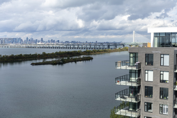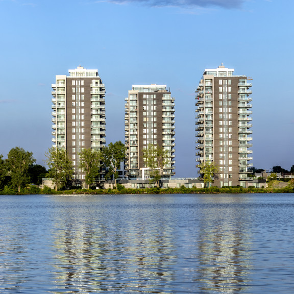 L’ensemble spectaculaire se compose de trois tours d’habitations de 15 étages, aux parements de brique et d’aluminium, réunies autour d’un vaste bassin aquatique. Il regroupe 240 logements proposés à la location puis à la vente, en trois phases successives.