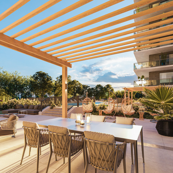 L'espace extérieur est aménagé avec une piscine, des pergolas, une terrasse et un stationnement pour visiteurs et acheteurs.
